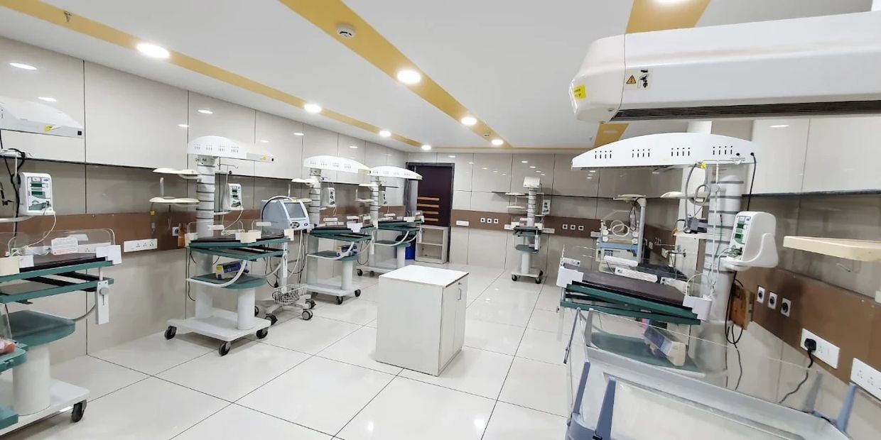 We have a state-of-the-art NICU (Neonatal Intensive Care Unit) equipped with latest ventilators, CPAP machines, Nitric oxide, multichannel monitors, incubators, open care warmers, phototherapy lights, in house blood gas machine, TPN laminar flow and an ultrasound machine. We are the first unit in Gujarat to have facilities for Cooling machine and Cerebral Function Monitor for infants with Hypoxic Ischaemic Encephalopathy which is a big step towards increasing intact survival. We have provision for 25 intensive care beds in our NICU and a further 15 beds in the SCBU (Special Care Baby Unit). We have our own fully equipped ambulance and a newborn transport trolley with newborn transport ventilator. The transport team is led by a dedicated Transport Consultant. We also have a babypod system, which is specifically designed for interhospital transfer. We strongly promote Kangaroo mother care and developmental care and provide the positioning aids for keeping the babies comfortable. We have 3 luxury rooms for mothers and a separate room for breast feeding as well as storage of breast milk.